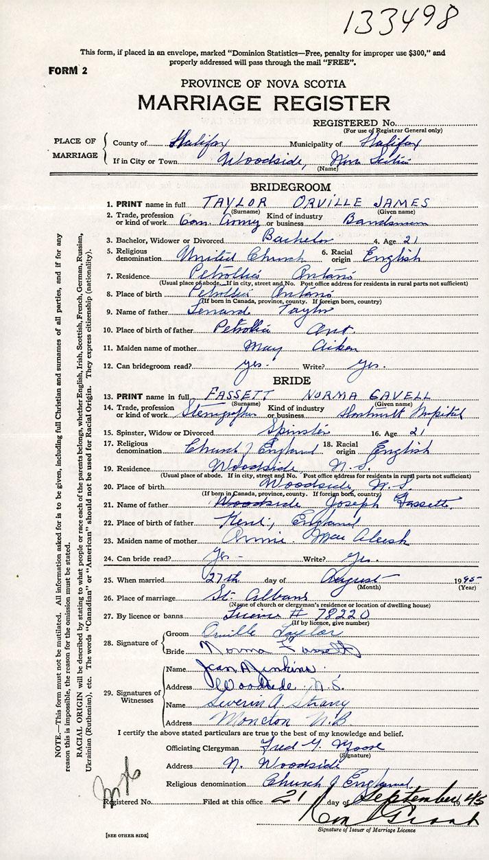 PLACE OF MARRIAGE County of Halifax in City or Town Woodside