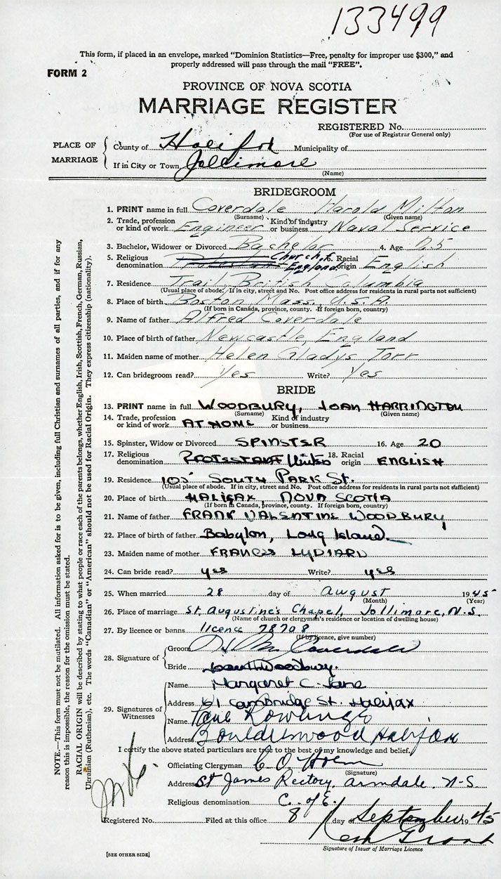 26. Place of marriage Saint Augustine's Chapel Jollimore, Halifax County
