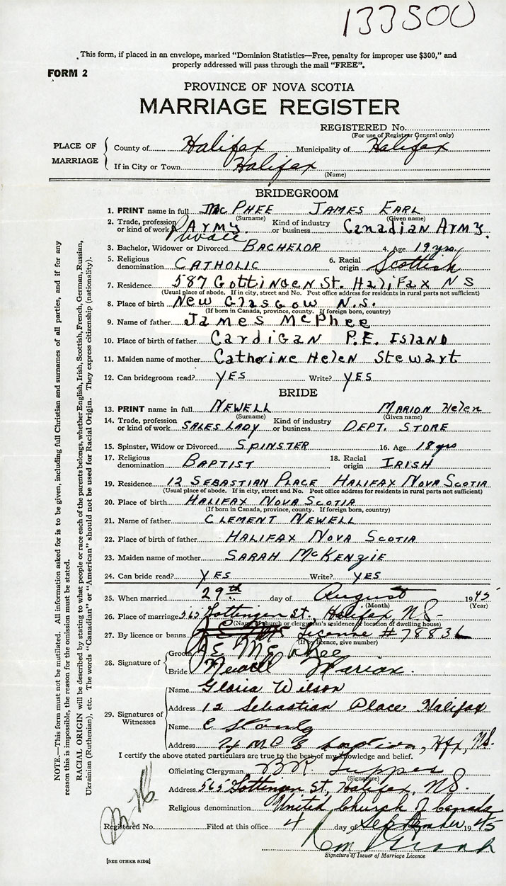 26. Place of marriage 565 Gottingen Street Halifax, Halifax County