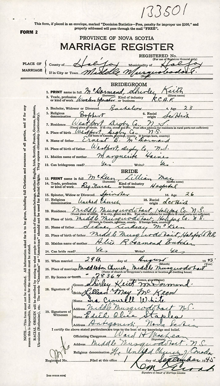 26. Place of marriage Middleton Church Middle Musquodoboit, Halifax County