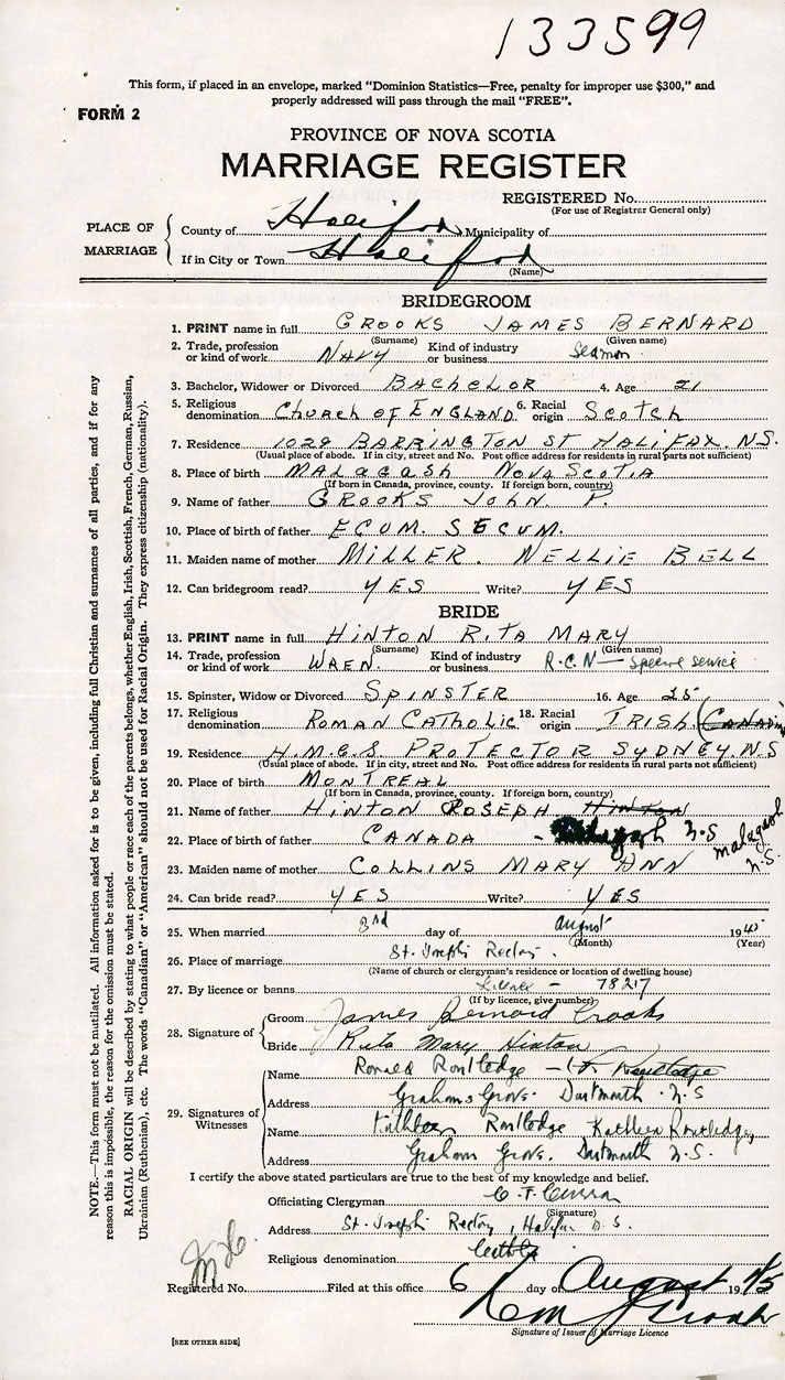 PLACE OF MARRIAGE County of Halifax in City or Town Halifax