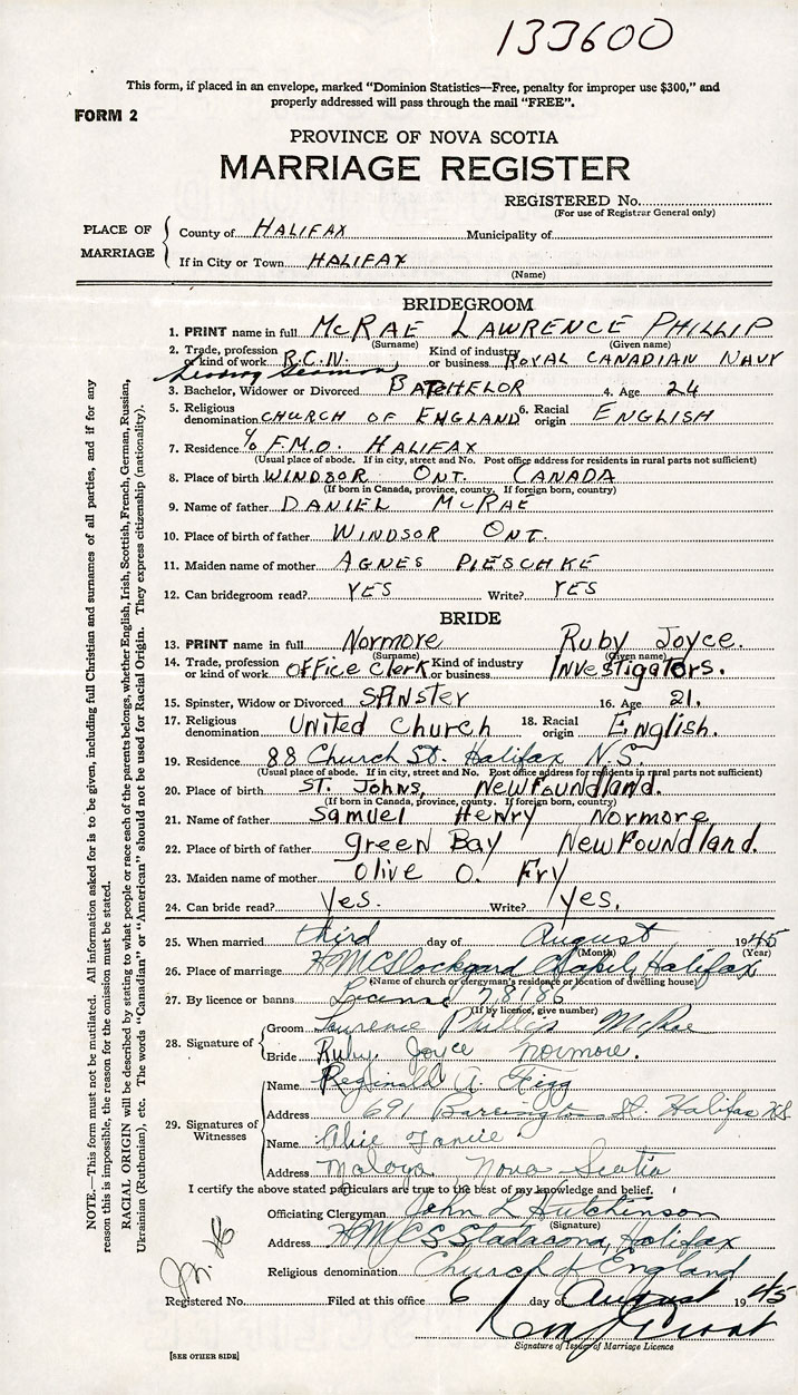 26. Place of marriage H.M.C. Dockyard Chapel Halifax, Halifax County