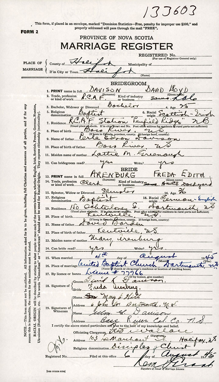 26. Place of marriage United Baptist Church Dartmouth, Halifax County