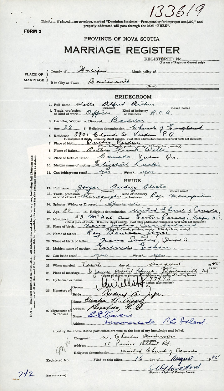 26. Place of marriage St James United Church Dartmouth, Halifax County