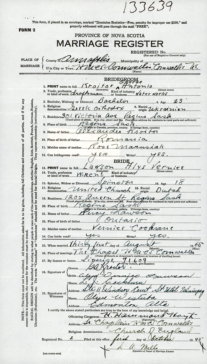 26. Place of marriage The Chapel H. M. C. S. Cornwallis Cornwallis, Annapolis County