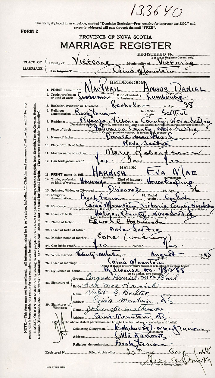 26. Place of marriage Cains Mountain, Victoria County