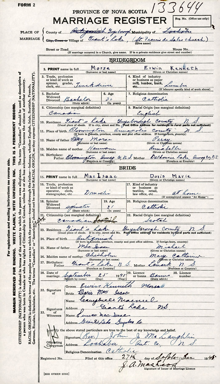 PLACE OF MARRIAGE County of Guysborough in City or Town Giant's Lake