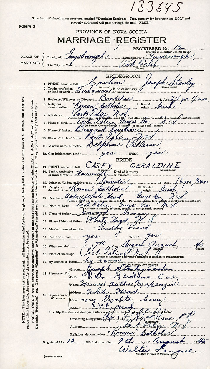 PLACE OF MARRIAGE County of Guysborough in City or Town Port Felix