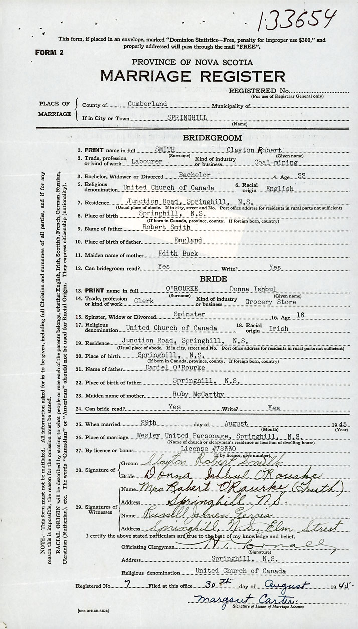 26. Place of marriage Wesley United Parsonage Springhill, Cumberland County
