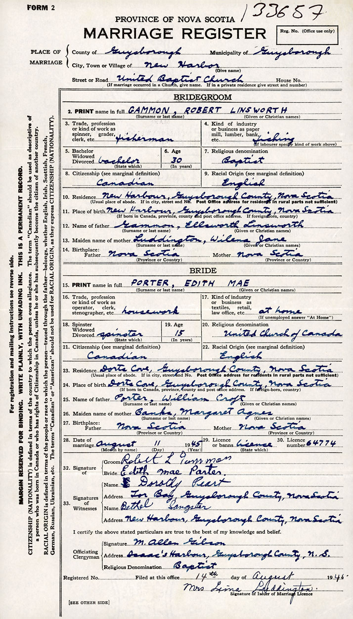 PLACE OF MARRIAGE County of Guysborough in City or Town New Harbor
