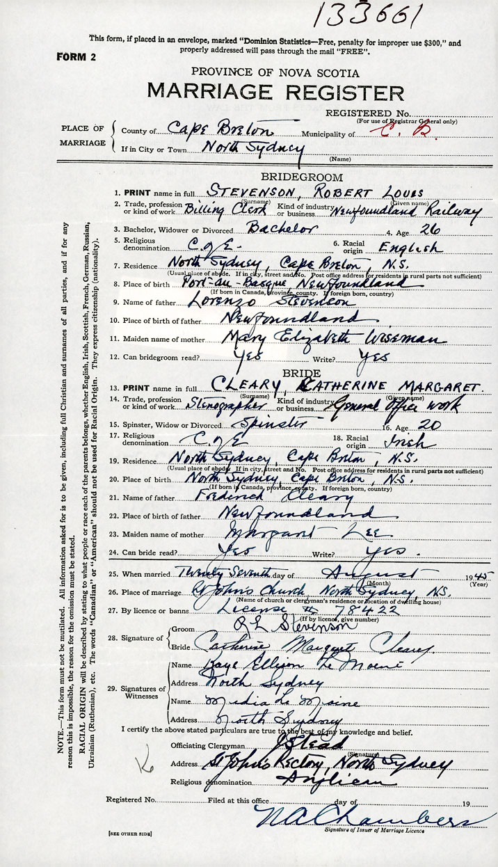 26. Place of marriage St. John's Church North Sydney, Cape Breton County