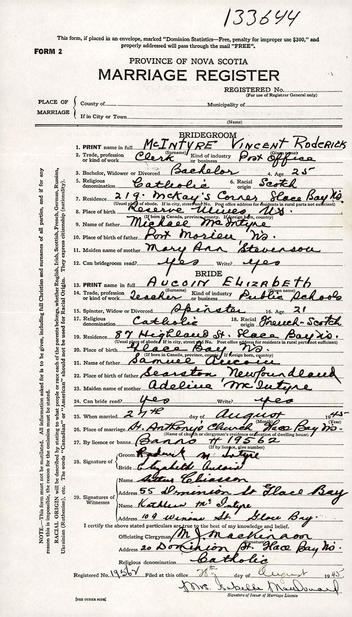 PLACE OF MARRIAGE County of Cape Breton in City or Town Glace Bay