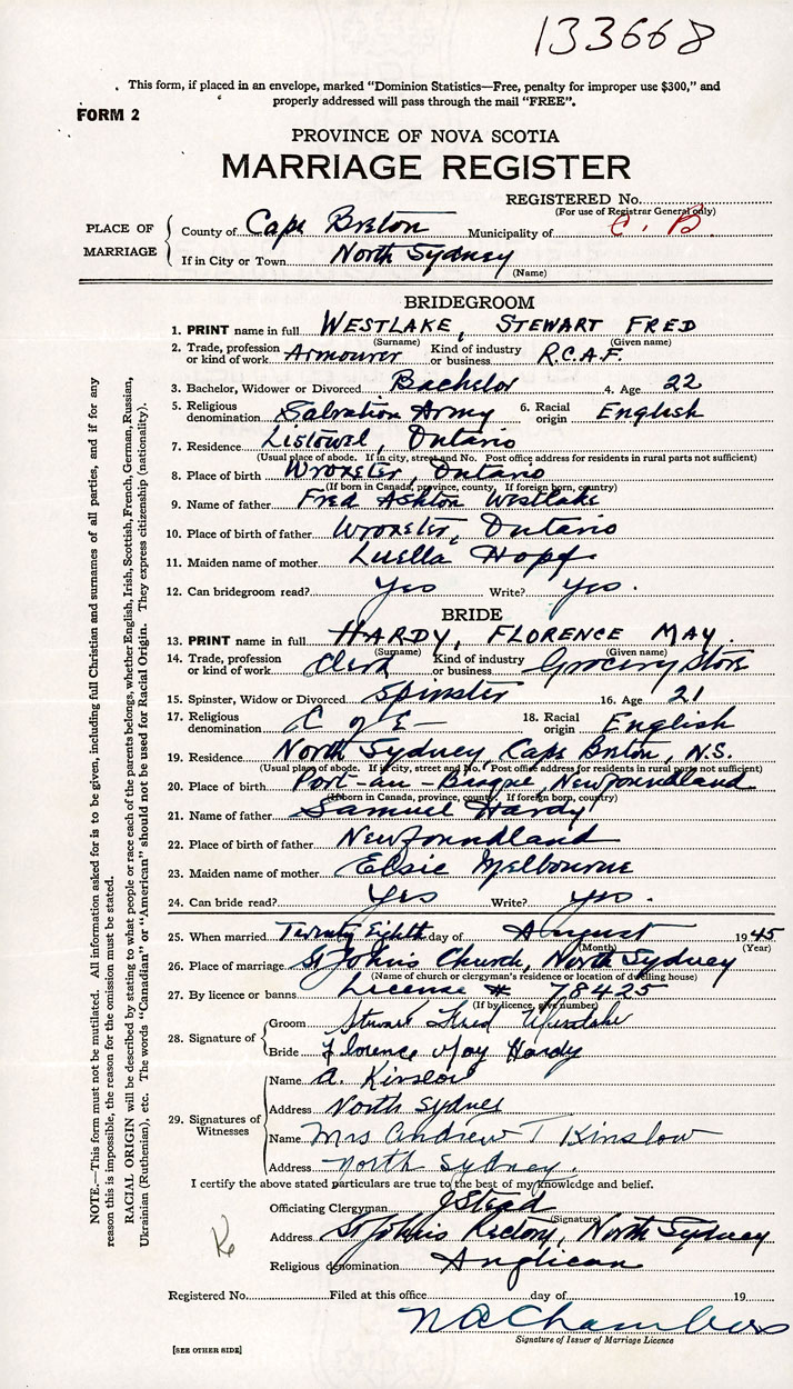 26. Place of marriage St. John's Church North Sydney, Cape Breton County