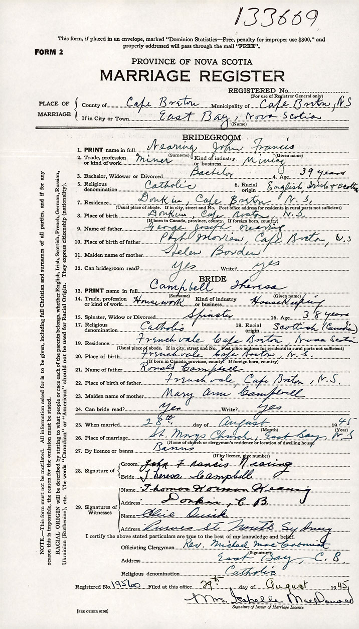 PLACE OF MARRIAGE County of Cape Breton in City or Town East Bay