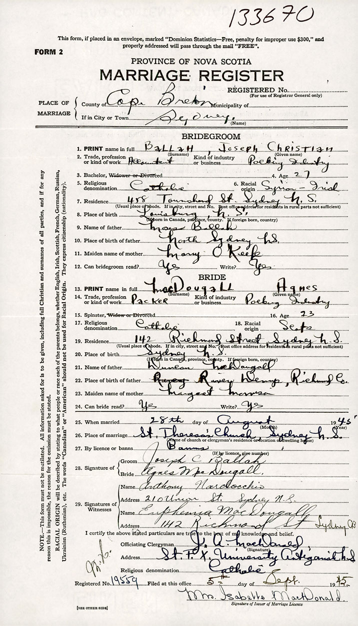 26. Place of marriage St. Theresa's Church Sydney, Cape Breton County