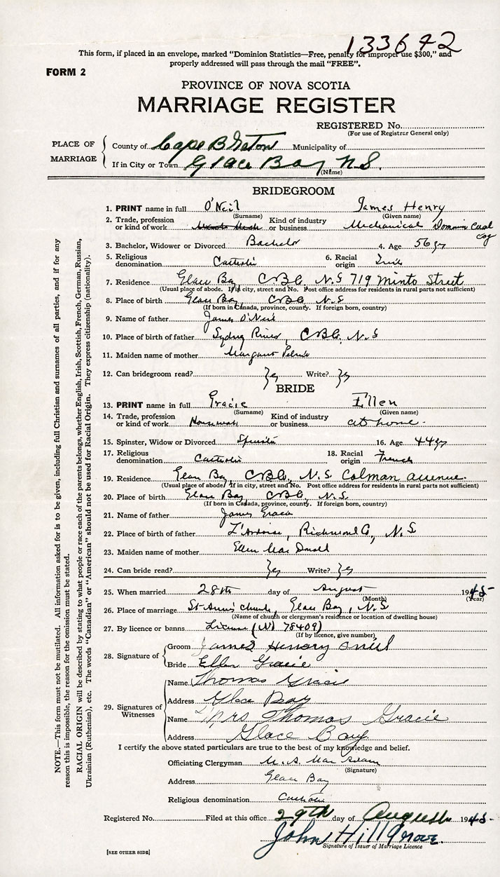 PLACE OF MARRIAGE County of Cape Breton in City or Town Glace Bay