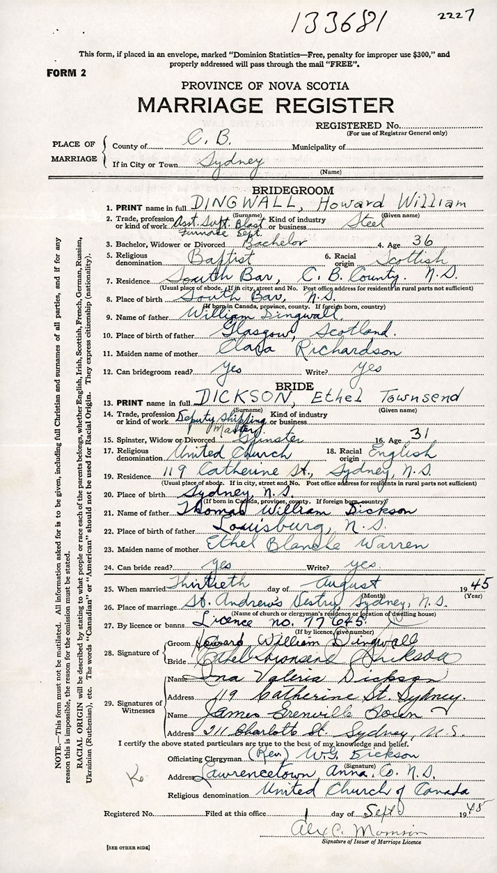 PLACE OF MARRIAGE County of Cape Breton in City or Town Sydney