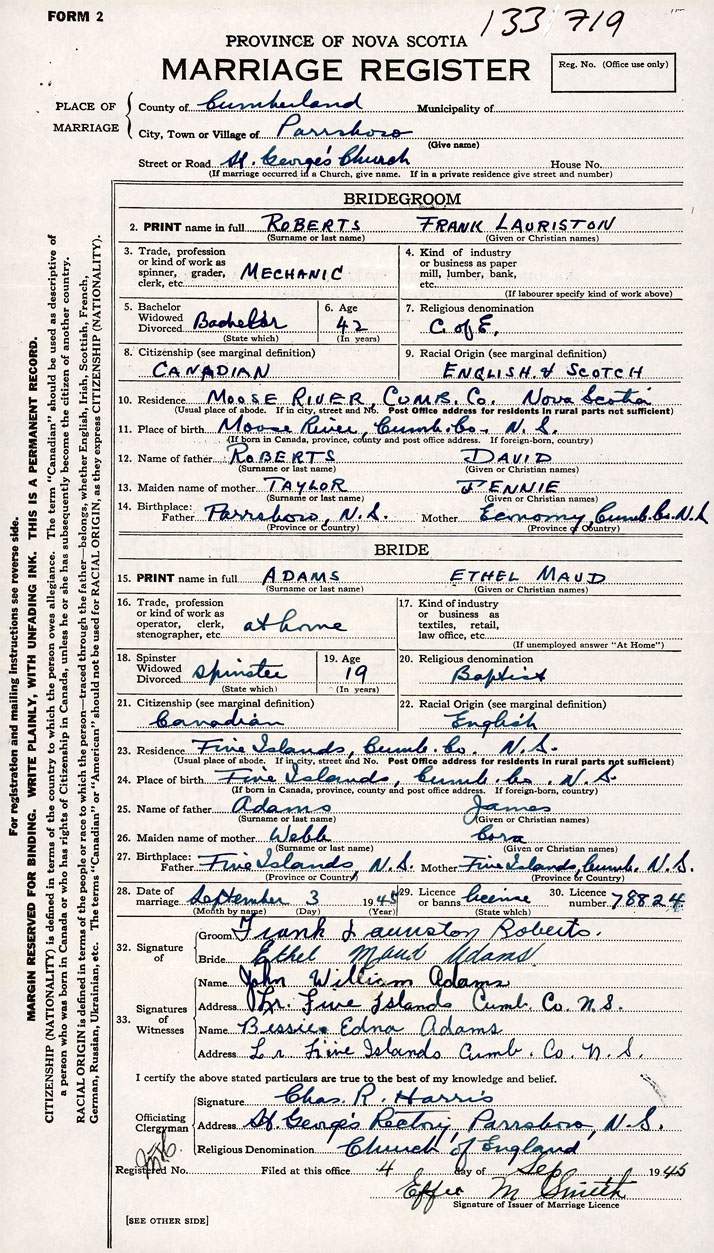 26. Place of marriage St. George's Church Parrsboro, Cumberland County