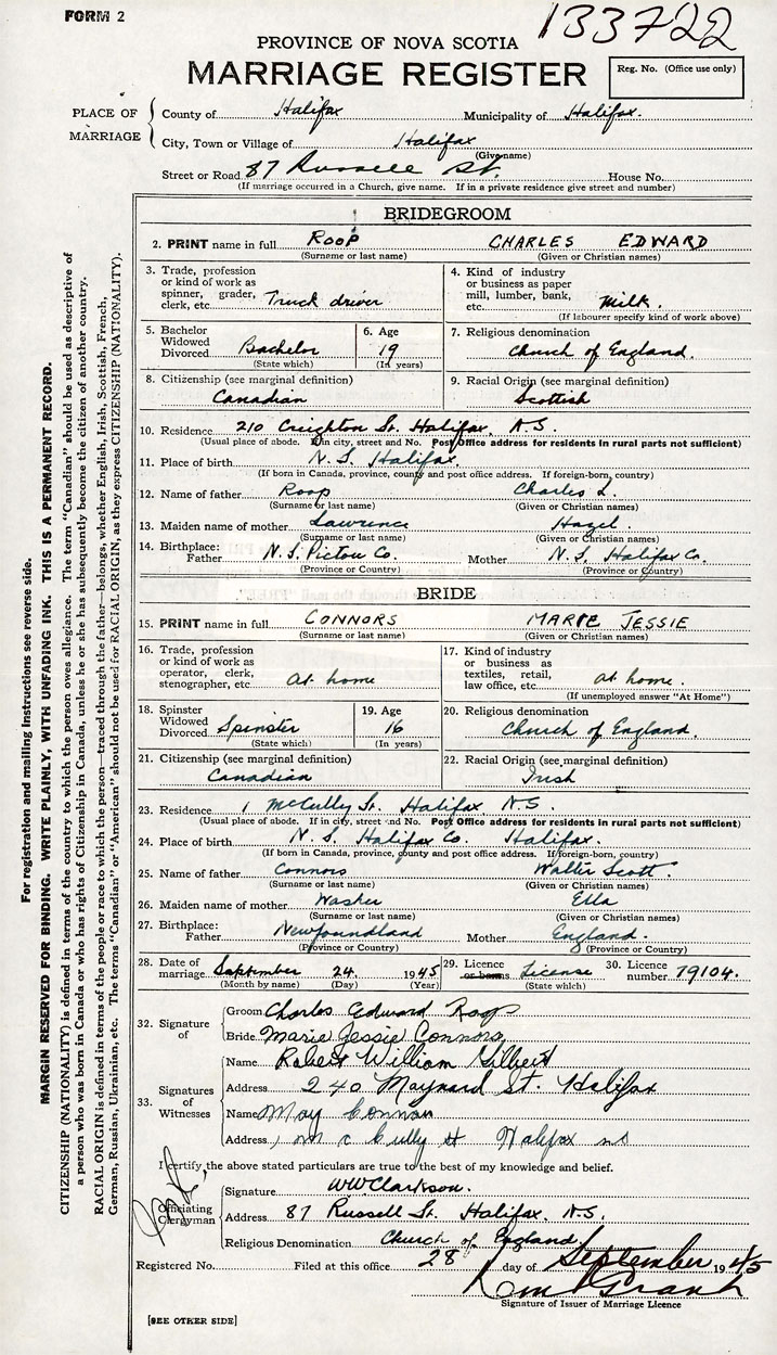26. Place of marriage 87 Russell St. Halifax , Halifax County