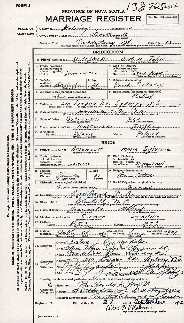 PLACE OF MARRIAGE County of Halifax in City or Town Dartmouth