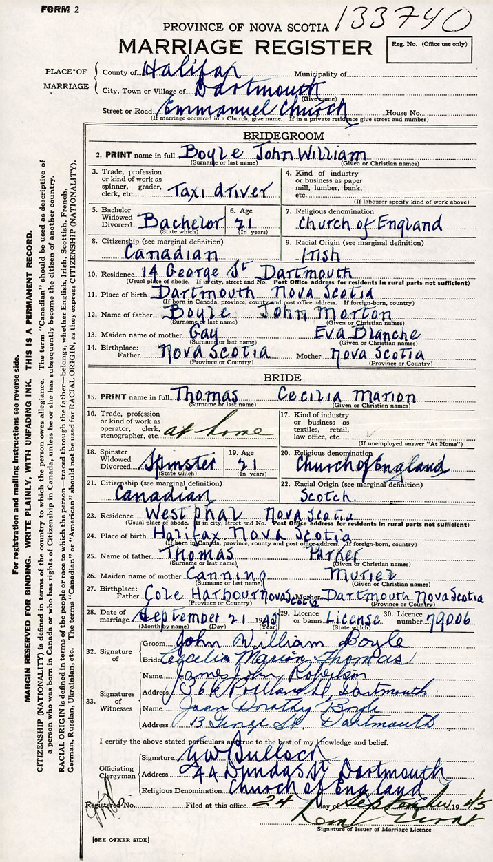 PLACE OF MARRIAGE County of Halifax in City or Town Dartmouth