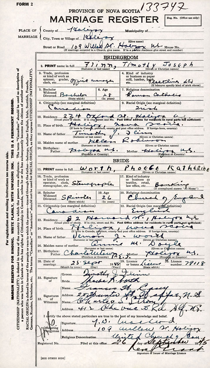 PLACE OF MARRIAGE County of Halifax in City or Town Halifax