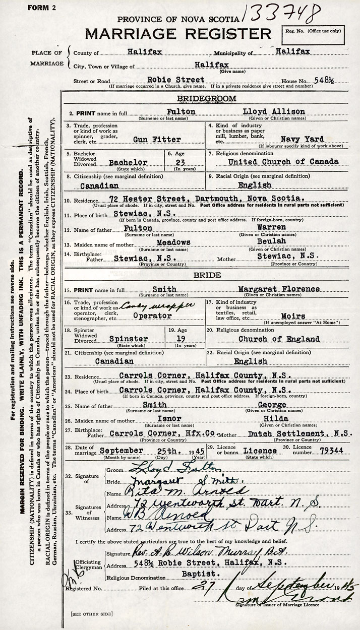 26. Place of marriage 548 1/2 Robie Street Halifax, Halifax County