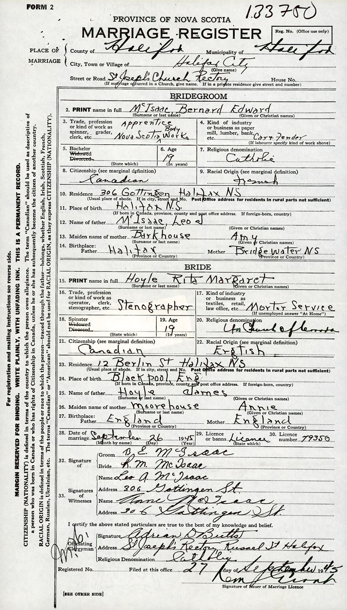 According to a certified copy of the Decree Absolute for Divorce dated 1969-10-7 and filed in the Office of the Registrar General under Divorce number 69-001747, it is ordered that the marriage of Bernard Edward McIsaac and Rita Margaret Hoyle (Registered under marriage number 1945-133750) be null and void.