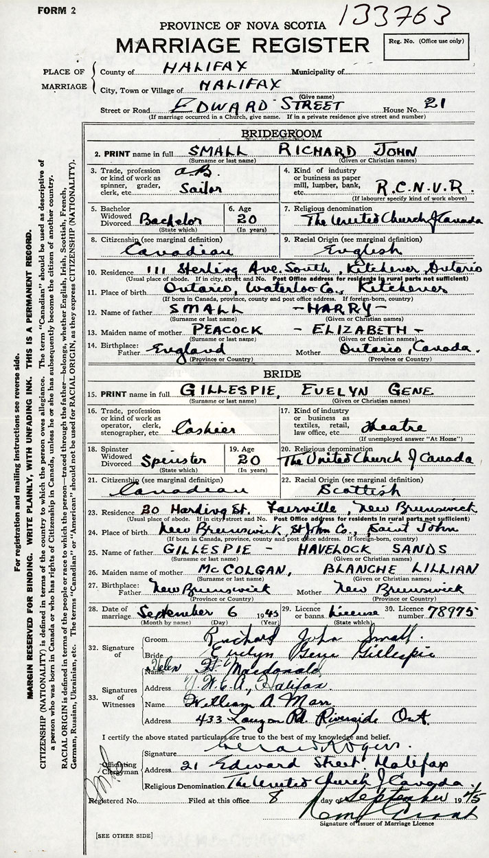 26. Place of marriage 21 Edward Street Halifax, Halifax County