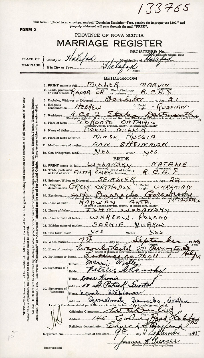 26. Place of marriage Waverly Hotel 27 Barrington St Halifax, Halifax County