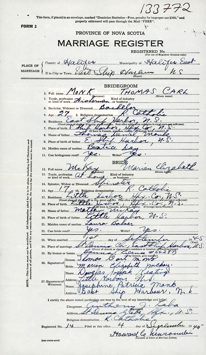 PLACE OF MARRIAGE County of Halifax in City or Town East Ship harbor