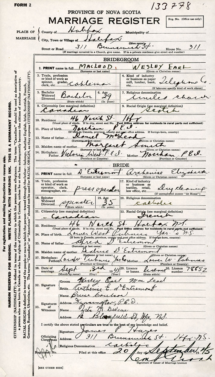26. Place of marriage 311 Brunswick Street Halifax, Halifax County