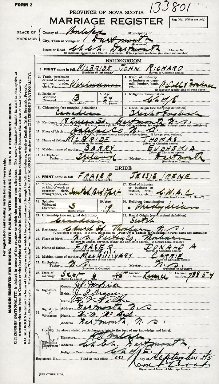 PLACE OF MARRIAGE County of Halifax in City or Town Dartmouth