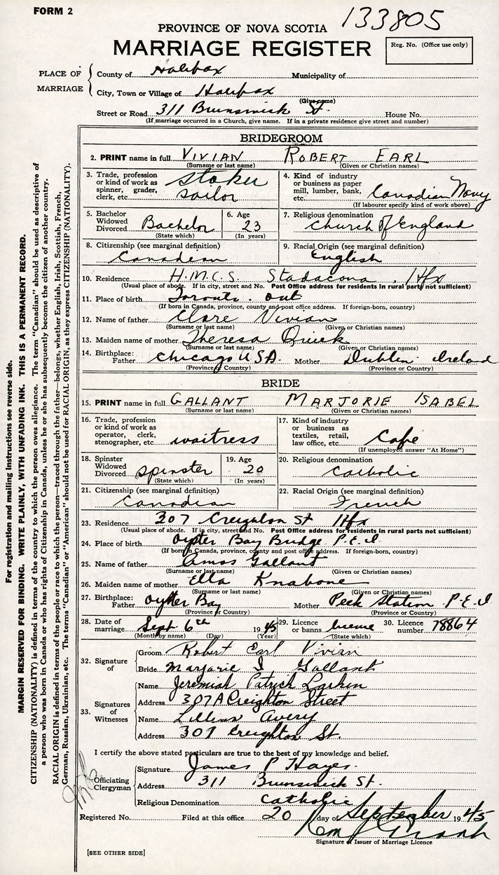 26. Place of marriage 311 Brunswick Street Halifax, Halifax County