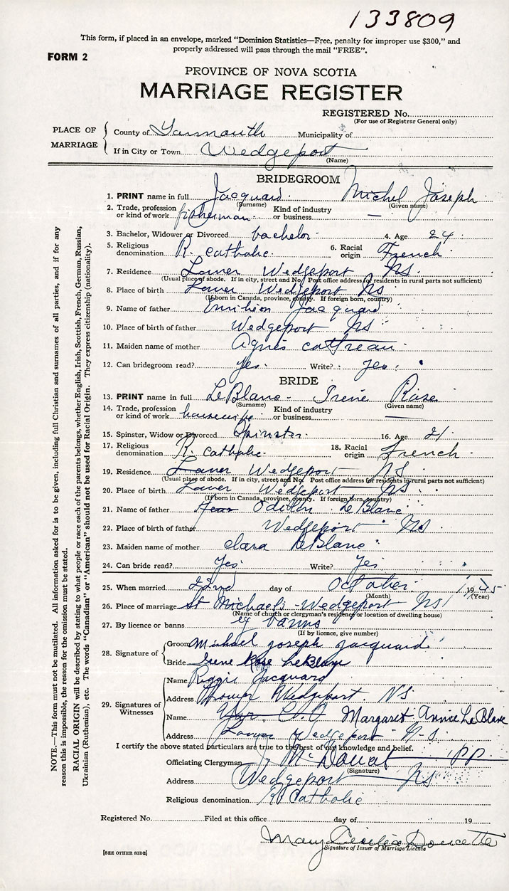 26. Place of marriage St. Michael's Wedgeport, Yarmouth County