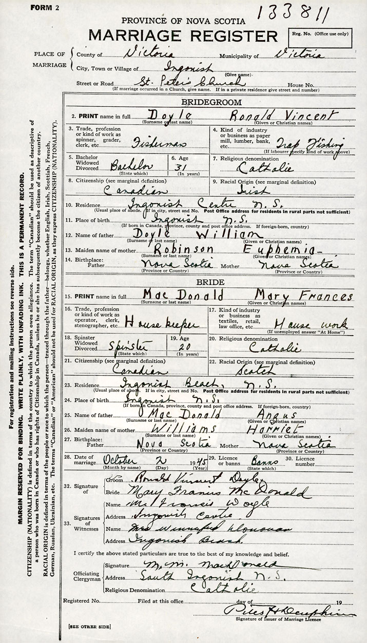 Groom Ronald Vincent Doyle