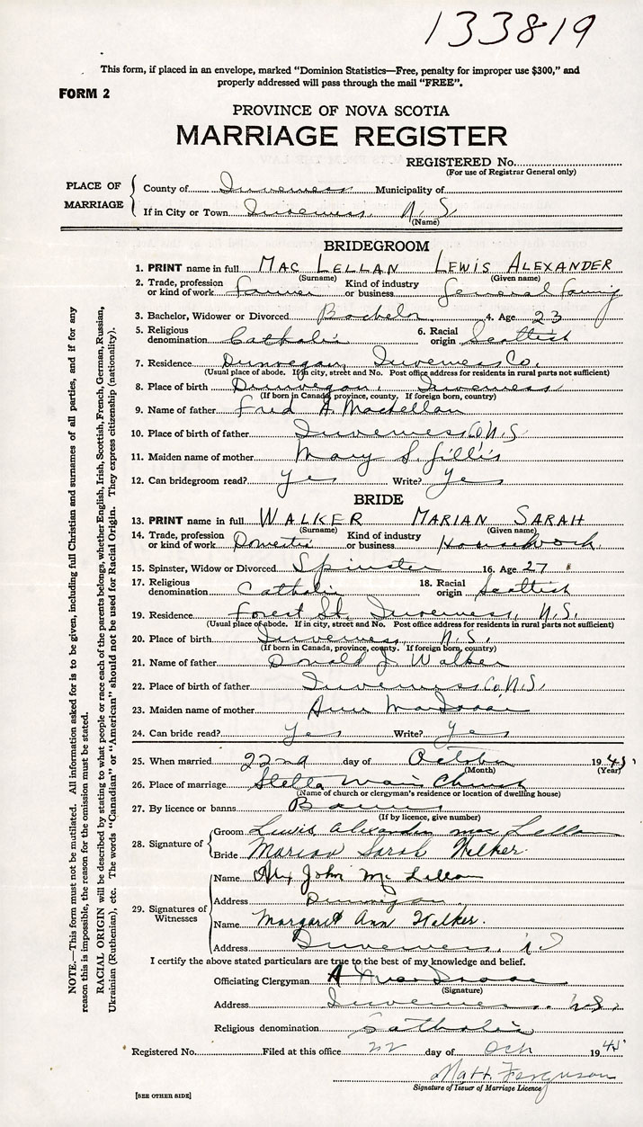 26. Place of marriage Stella Maris Church Inverness, Inverness County