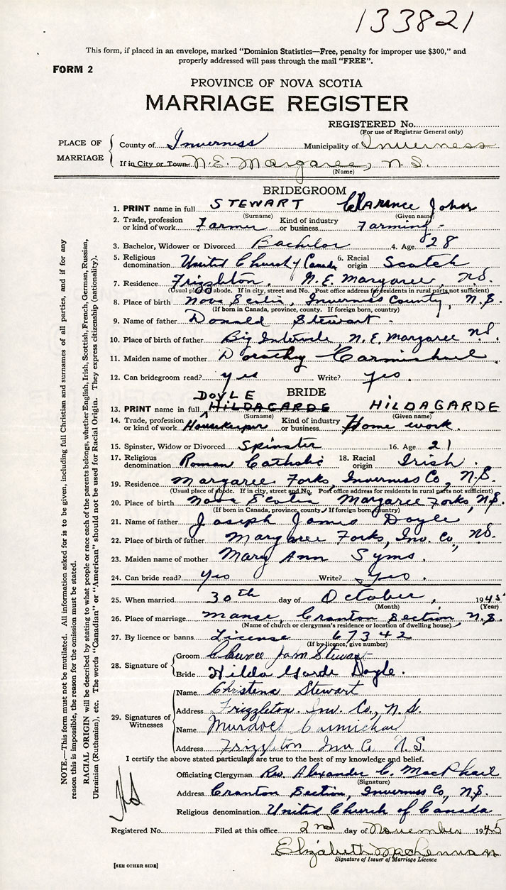 26. Place of marriage The United Church Manse Cranton Section, Inverness County