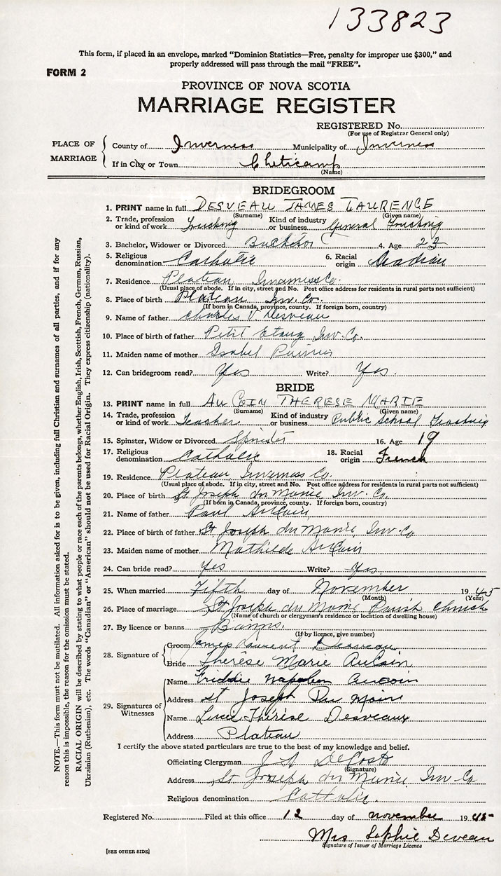 26. Place of marriage St Joseph du Moine Parish Church St Joseph du Moine, Inverness County