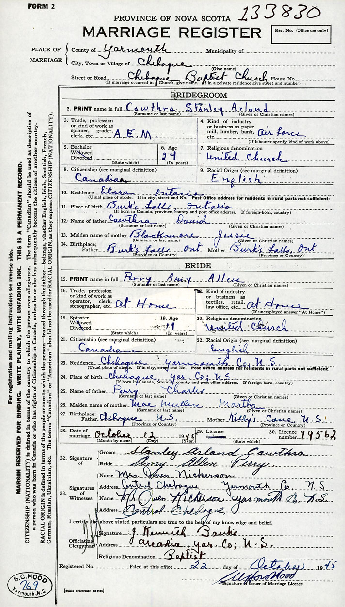 Groom Stanley Arland Cawthra