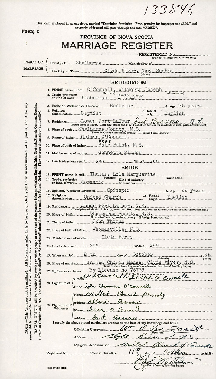 26. Place of marriage United Church Manse Clyde River, Shelburne County