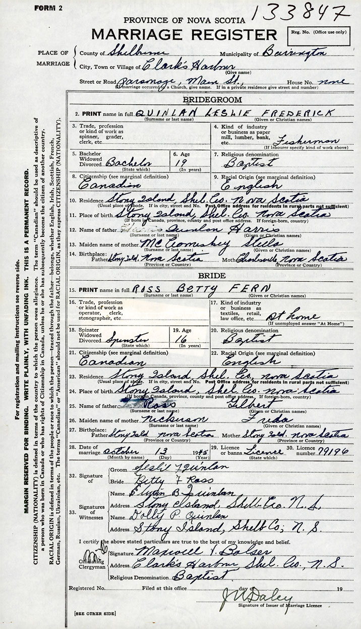 PLACE OF MARRIAGE County of Shelburne in City or Town Clark's Harbour