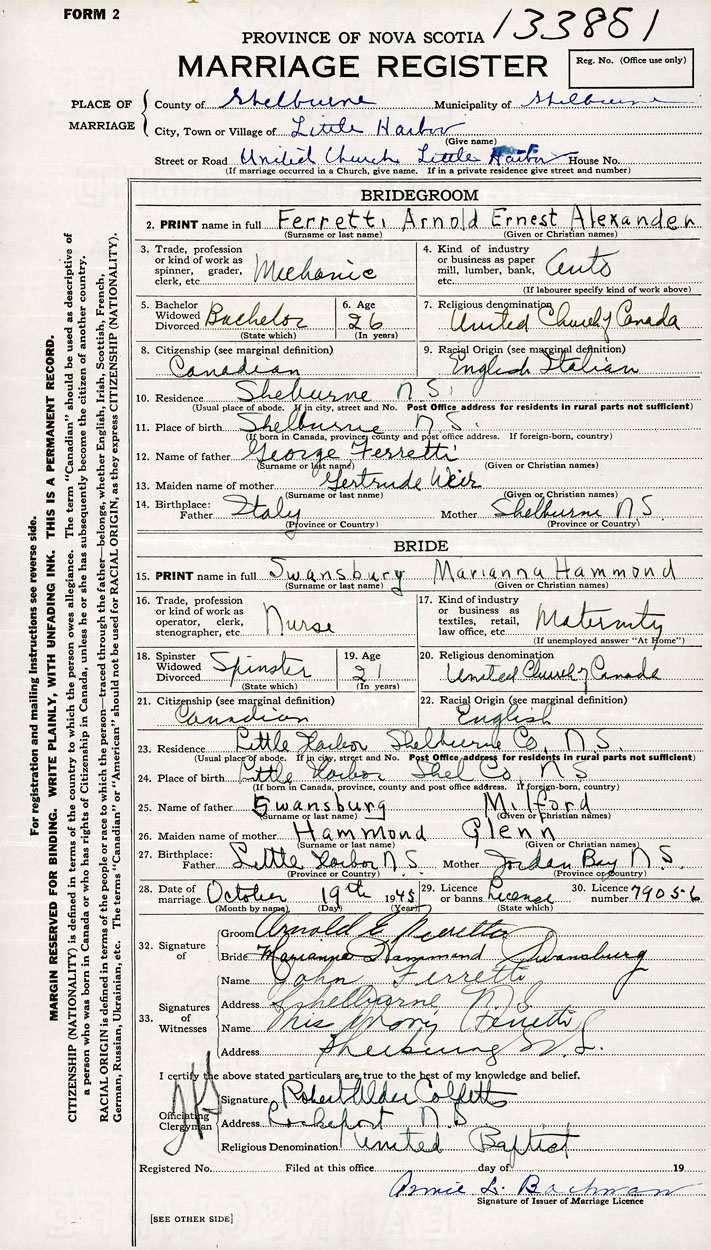 PLACE OF MARRIAGE County of Shelburne in City or Town Little Harbour