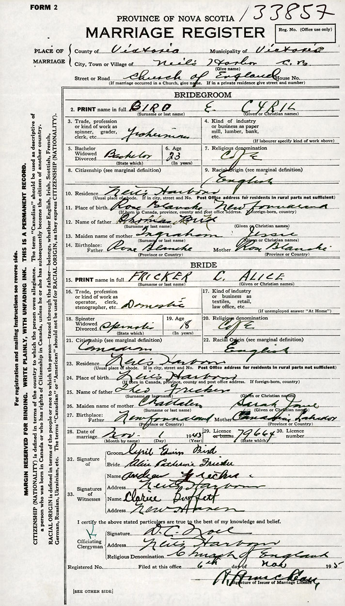 PLACE OF MARRIAGE County of Victoria in City or Town Neil's Harbour