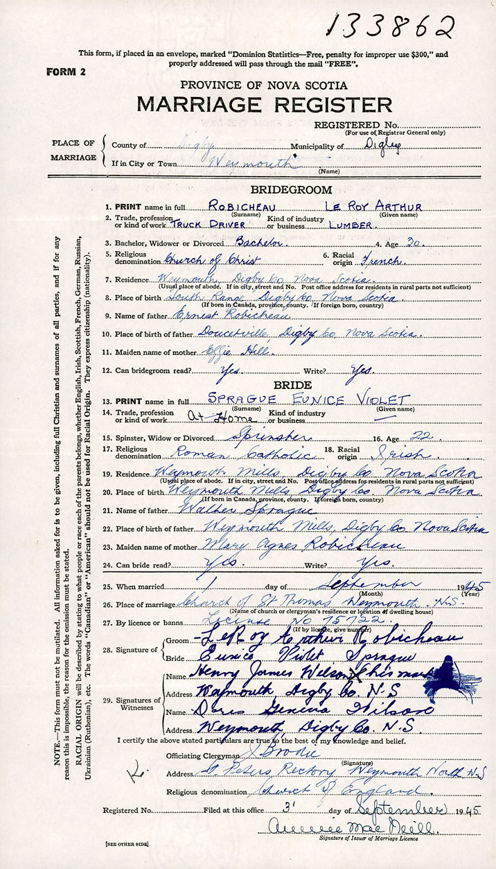 10. Place of birth of father Doucetville Digby Co Nova Scotia