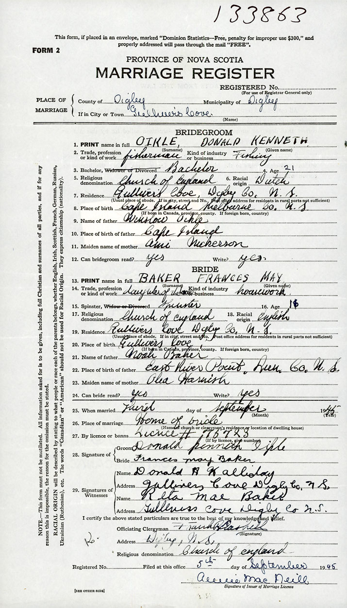 PLACE OF MARRIAGE County of Digby in City or Town Gulliver's Cove