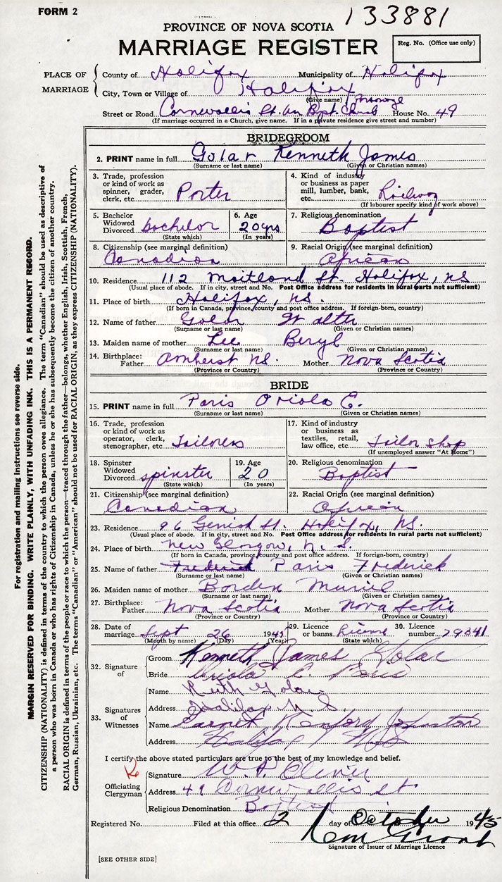 26. Place of marriage Cornwallis St. Baptist Church Halifax , Halifax County