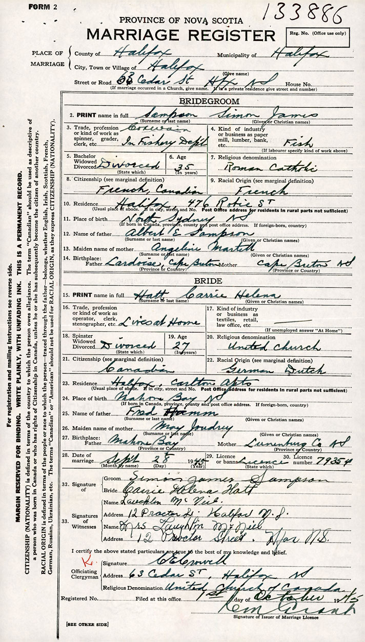 PLACE OF MARRIAGE County of Halifax in City or Town Halifax