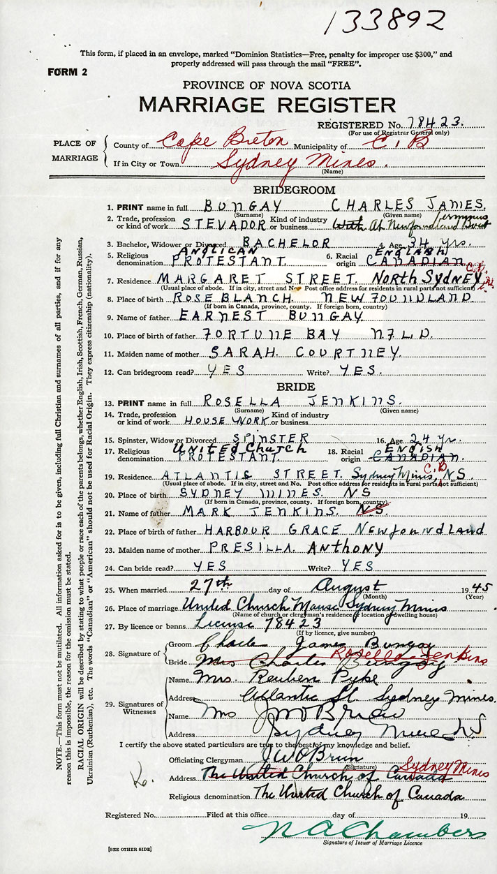 PLACE OF MARRIAGE County of Cape Breton in City or Town Sydney Mines