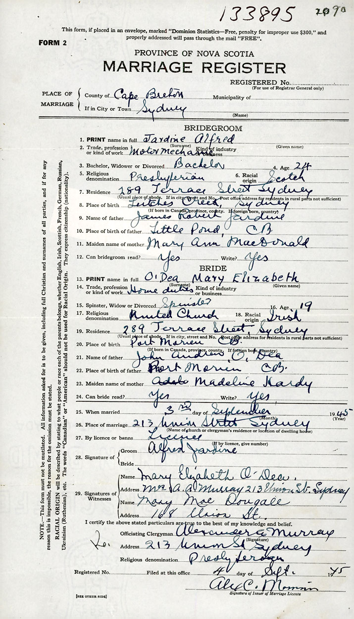 26. Place of marriage 213 Union Street Sydney, Cape Breton County